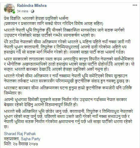 धेरै ठाउँमा नेपालको सीमा अतिक्रमण गरेको भारतले ६ महिना पहिले नयाँ नक्सा जारी गरी नेपाली भू-भाग कालापानी, लिपुलेक र लिम्पियाधुरालाई आफ्नो दावी गरेकोमा अहिले थप हस्तक्षेप गर्दै सो सडक मार्ग निर्माण गरेको जनाउँदै साझा पार्टी कडा भत्सर्ना गरेको जनाएको छ ।