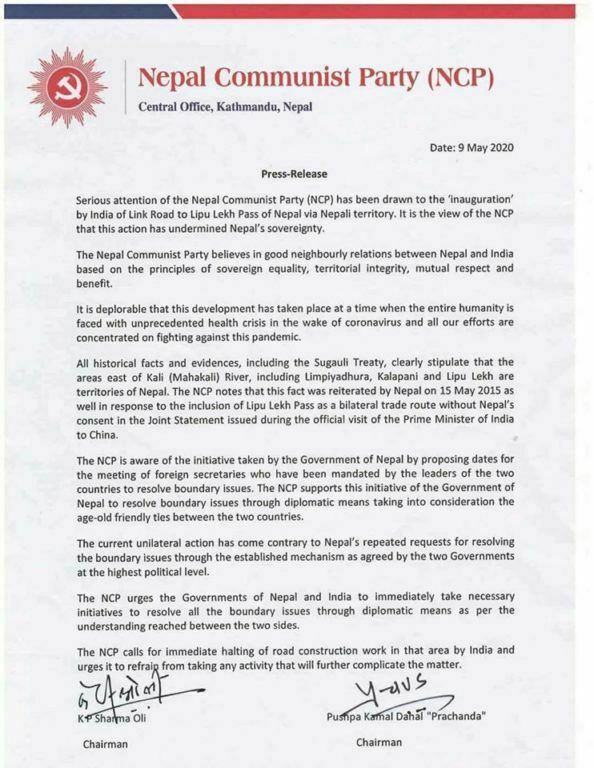 सो पार्टीका अध्यक्षद्वय प्रचण्ड र केपी ओलीले एक संयुक्त वित्रप्ति जारी गर्दै भारतले मानसरोबर जोड्ने सडक नेपाली भूमि मिचेर बनाएको भन्दै आपत्ति जनाएका हुन् ।