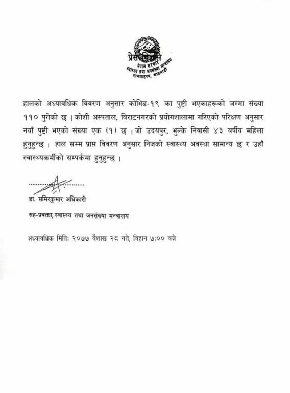 काठमाडौं । नेपालमा थप एक जनामा कोरोना भाइरसको संक्रमण भएको पुष्टि भइएको छ । योसँगै नेपालमा जम्मा कोरोना संक्रमितको संख्या ११० पुगेको छ ।