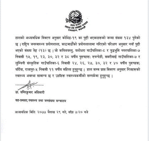 विभिन्न जिल्लामा गरेर आज थप ५७ जनामा कोभिड–१९ सङ्क्रमण भएको पुष्टि भएपछि स्वास्थ्य तथा जनसङ्ख्या मन्त्रालयका सहप्रवक्ता डा. समिरकुमार अधिकारीले राष्ट्रिय प्रयोगशालामा परीक्षणका क्रममा उनीहरुको सङ्क्रमण भएको बताए। योसँगै हालसम्म सङ्क्रमितको सङ्ख्या १९१ पुगेको छ ।