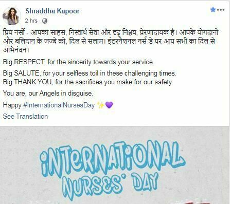 काठमाडौं – भारतीय चर्चित अभिनेत्री श्रद्धा कपूरले विश्व नर्स दिवसमा स्टाटसमार्फत् जनताको सेवामा अहोरात्र खटिने नर्सहरुलाई शुभकामना दिएकी छिन् । सामाजिक सञ्जाल फेसबुकमा उनले हिन्दी र अंग्रेजी भाषामा लेखेकी छिन् :