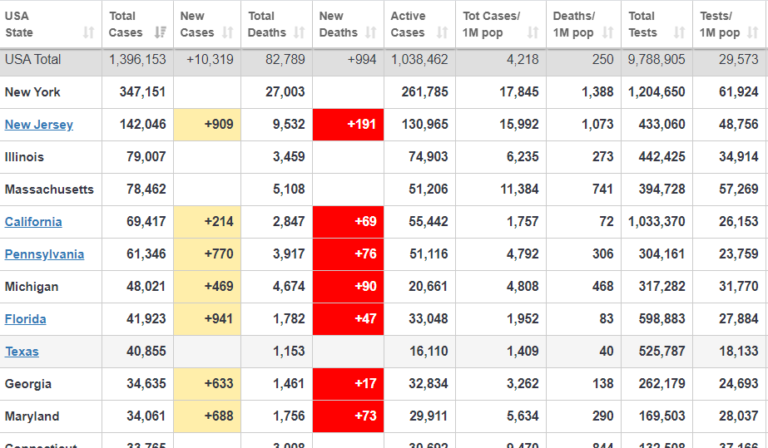 बितेको २४ घण्टामा मात्र अमेरिकामा कोरोनाको कारण ८ सय ९५ जनाको ज्यान गइसकेको र ९ हजार ६ सय ५६ जनामा कोरोना संक्रमण पुष्टि भएको छ । हालसम्म २ लाख ७४ हजार ९ सय २ जना कोरोना उपचारपछि निको भएर घर फर्किएका छन भने १६ हजार ५ सय १ जनाको अवस्था गम्भीर रहेको छ । साथै ९७ लाख ७२ हजार ७ सय ११ जनामा हालसम्म कोरोना परीक्षण गरिएको छ ।