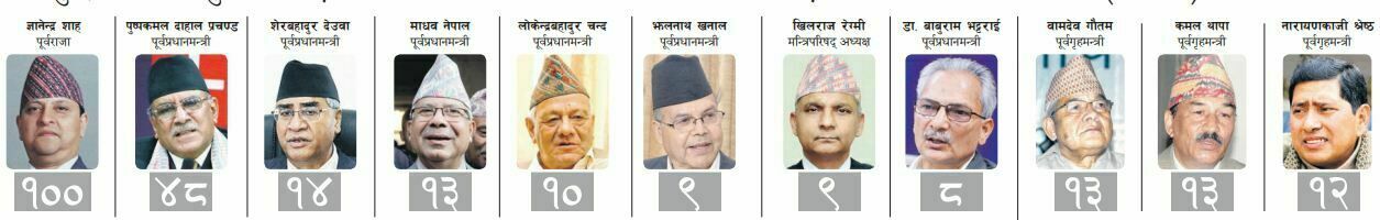 पत्रिकाका अनुसार पूर्वराजा ज्ञानेन्द्रको सुरक्षामा १०० जना सुरषाकर्मी खटिएका छन् । यस्तै प्रचण्डको सुरक्षामा ४८, शेरबहादुर देउवाको सुरक्षामा १४, माधवन नेपालको १३, लोकेन्द्र बहादुर चन्दको सुरक्षामा १० जना सशस्त्र प्रहरी खटिएका छन् ।