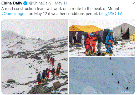 चिनियाँ पत्रिका चाइना डेलीको अनलाइन संस्करणले मे ११ मा आज बाटो निर्माण टोलीले आज काम गर्ने भन्दै तस्वीरसहित समाचार प्रकाशित गरेको छ । मौसमले साथ दिएमा आज काम थाल्ने उसले उल्लेख गरेको छ ।
