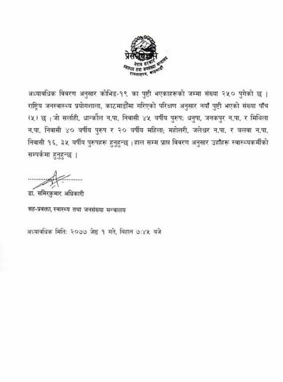 नेपालमा फेरी आज थप ५ जनामा कोरोना संक्रमण पुष्टि भएको छ । योसँगै नेपालमा जम्मा कोरोना संक्रमितको संख्या २५० पुगेको छ ।
