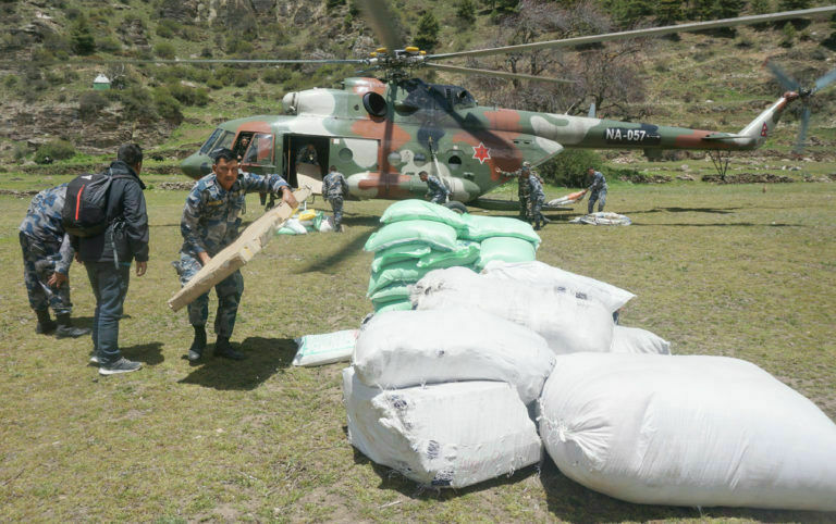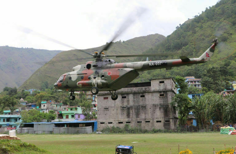 नेपाल-भारत सीमा क्षेत्रमा दार्चुला जिल्लाको छाङरु (गागा) मा सशस्त्र प्रहरी बल नेपालको सीमा सुरक्षा निगरानी चौकी (विओपी) का लागि आवश्यक सशस्त्र प्रहरीसहित खाद्यान्न र बन्दोबस्तीका सामान झार्दै नेपाली सेनाको हेलिकप्टर ।