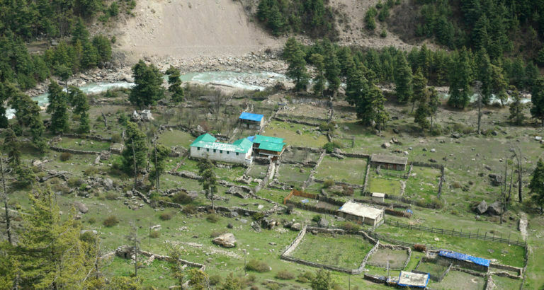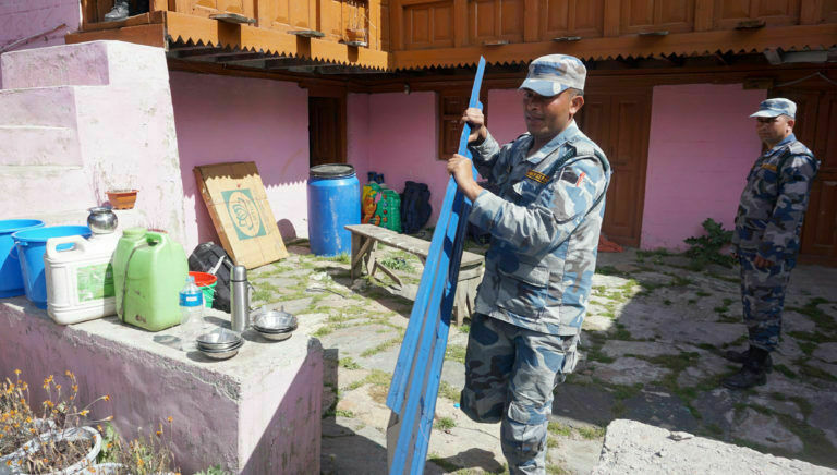 सरकारले नेपाल-भारत सीमा क्षेत्र दार्चुला जिल्लाको व्याँस गाउँपालिका १ छाङरु (गागा) मा स्थापना गरेको सीमा निगरानी चौकी (विओपी) मा बस्ने सशस्त्र प्रहरी खाद्यान्न ओसार्दै । चौकीभन्दा केहीमाथि सेनाको हेलिकप्टरले सामान छाडेपछि खाद्यान्न तथा अन्य सामान उनीहरुले ओसारेका थिए ।