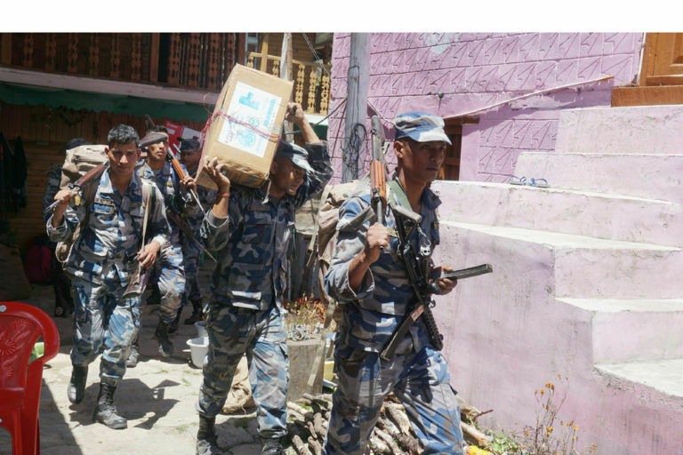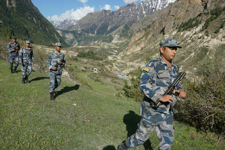 नेपाल-भारत सीमा क्षेत्र दार्चुला जिल्लाको व्याँस गाउँपालिका-१ छाङरु (गागा) मा बुधबार स्थापना गरिएकोे सशस्त्र प्रहरी बल नेपालको सीमा निगरानी चौकी (विओपी) का लागि आवश्यक हतियार र बन्दोबस्तीका सामान ओसार्दै सशस्त्र प्रहरी । सेनाको हेलिकप्टरले केही माथि सामान झारेपछि उनीहरुले बोकेर सामान लगेका हुन ।
