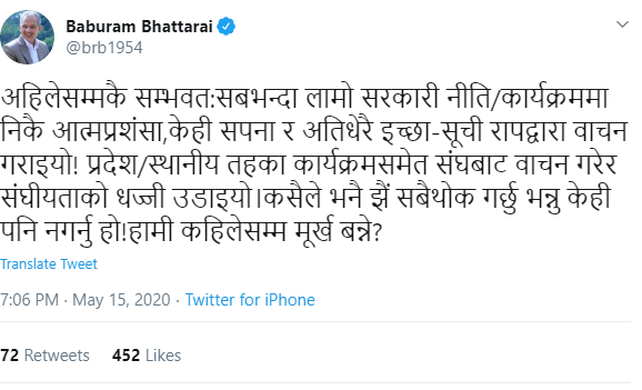 प्रतिनिधिसभाको बैठकपछि ट्वीट गर्दै नेता भट्टराईले सरकारले प्रस्तुत गरेको नीति तथा कार्यक्रम अहिलेसम्मकै सम्भवतः सबभन्दा लामो सरकारी नीति तथा कार्यक्रममा निकै आत्मप्रसंशा, केही सपना र अति धेरै इच्छा सूची रापद्वारा वाचन गराइएको टिप्पणी गरेका छन् ।