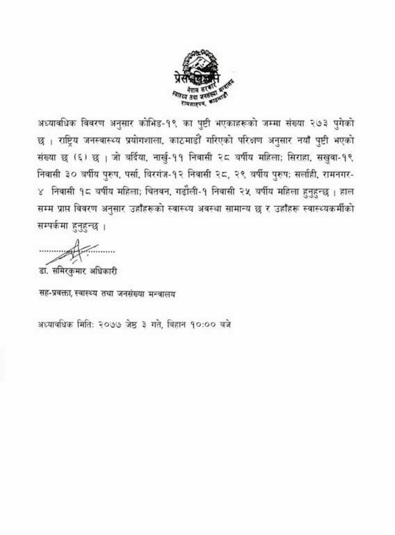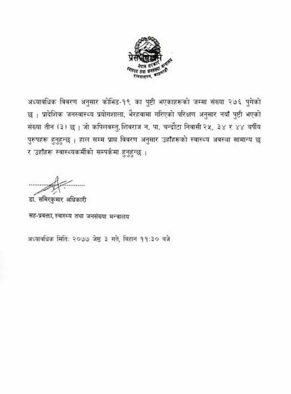 शनिबार महोत्तरीका ५२ वर्षिय पुरुष र काभ्रेका २६ वर्षिय पुरुषमा कोरोना संक्रमण पोजेटिभ देखिएको छ । शनिबार नै कपिलवस्तुका तीन जनामा संक्रमण देखिएको थियो । मन्त्रालयका अनुसार कपिलवस्तुको शिवराज नगरपालिका चन्द्रौटाका २५, ३४ र ४४ वर्षिय पुरुषमा संक्रमण देखिएको हो ।