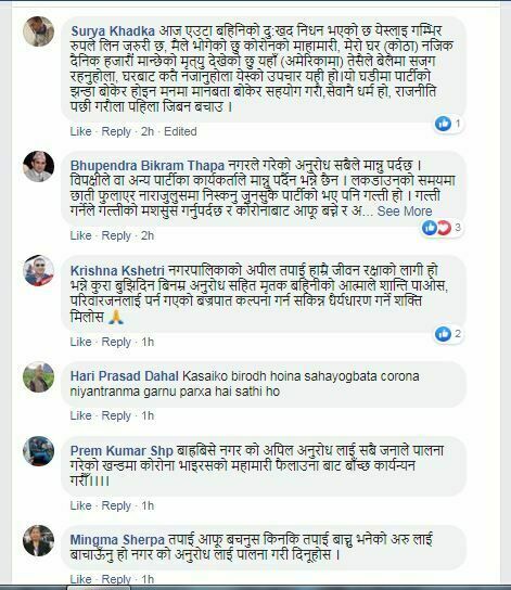 लकडाउनको बेला समेत स्थानीय नेपाली कांग्रेसले हुलहुज्जत र सडकमा निस्केर नाराबाजी गरेर गम्भीर गल्ति गरेकोप्रति उनले दुख व्यक्त गर्दै जुलुसमा उपस्थित भएका सबैलाई क्वारेन्टाईनमा बस्नको लागि अनुरोध गरेका छन् ।