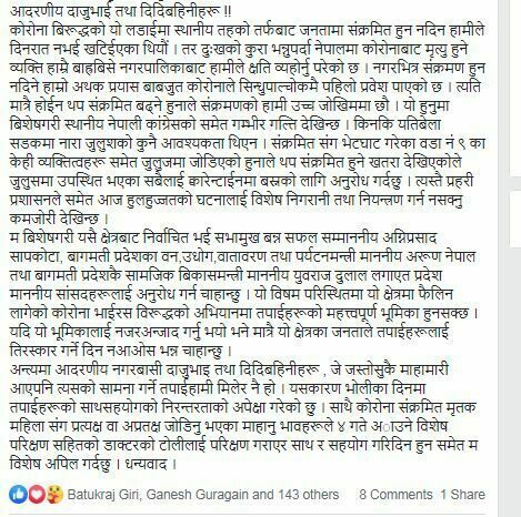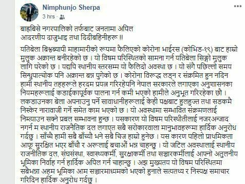 उनले लेखेका छन्- नगरभित्र संक्रमण हुन नदिने हाम्रो अथक प्रयास बाबजुत कोरोनाले सिन्धुपाल्चोकमै पहिलो प्रवेश पाएको छ । त्यति मात्रै होईन थप संक्रमित बढ्ने हुनाले संक्रमणको हामी उच्च जोखिममा छौँ ।