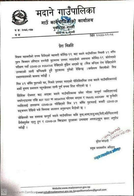 गत जेठ १ गते स्वास्थमा समस्या आई क्रिमशन हस्पिटल रुपन्देही बुटवलमा उपचार गराइरहेका उनलाई कोरोना संक्रमण देखिएको हो । उनमा कोरोना संक्रमण देखिएसँगै गाउँमा त्रास फैलिएको छ ।