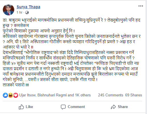 “काँग्रेसको सहयोगमा गोरखामा कृपापूर्वक यिनले चुनाव जितेको जनताजनार्दनले भुलेका छन र ? अनि, यी १ सिटे अस्थिरताका गोटीसँग कस्तो व्यवहार गरिदिनुपर्ने हो प्रमले ? अझ हठ र अहंकार पो भयो रे । काँग्रेसको सहयोगमा गोरखामा कृपापूर्वक यिनले चुनाव जितेको जनताजनार्दनले भुलेका छन र ? अनि, यी १ सिटे अस्थिरताका गोटीसँग कस्तो व्यवहार गरिदिनुपर्ने हो प्रमले ?” थापाले सामाजिक सञ्जालमा लेखेका छन् ।