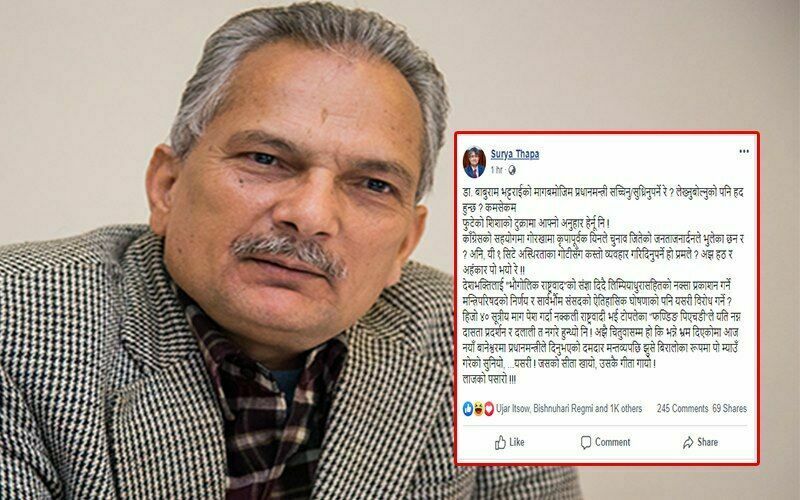 “काँग्रेसको सहयोगमा गोरखामा कृपापूर्वक यिनले चुनाव जितेको जनताजनार्दनले भुलेका छन र ? अनि, यी १ सिटे अस्थिरताका गोटीसँग कस्तो व्यवहार गरिदिनुपर्ने हो प्रमले ? अझ हठ र अहंकार पो भयो रे । काँग्रेसको सहयोगमा गोरखामा कृपापूर्वक यिनले चुनाव जितेको जनताजनार्दनले भुलेका छन र ? अनि, यी १ सिटे अस्थिरताका गोटीसँग कस्तो व्यवहार गरिदिनुपर्ने हो प्रमले ?” थापाले सामाजिक सञ्जालमा लेखेका छन् ।