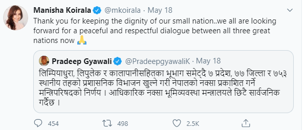 नेपालले नयाँ नक्सा जारी गरेसँगै उनले ट्वीट गर्दै नेपाल सानो भएपनि आत्मसम्मान राख्न सफल भएकोमा खुसी व्यक्त गरेकी थिइन् । उनले लेखेकी छिन्, ‘हाम्रो सानो देशको आत्मसम्मान कायम राख्न सफल भएकोमा धन्यवाद । अब हामी तीन महान देशहरुबीच शान्तिपूर्ण र सम्मानजनक संवादका लागि आशावादी छौं ।’
