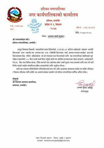 नगरपालिकाले आवश्यक कामकाज बाहेक घर बाहिर ननिस्कन र निस्कन नदिनका लागि सबैले आ-आफ्नो क्षेत्रबाट सहयोग गर्न अपिलसमेत गरेको छ ।