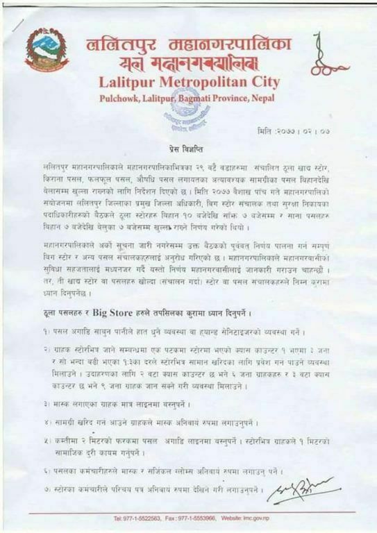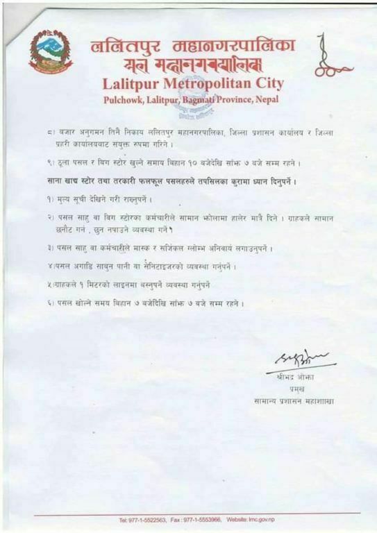 साथै महानगरपालिकाले अर्काे सूचना जारी नभएसम्मका लागि उक्त नियम मान्नका लागि सबैलाइ अनुरोध समेत गरेको छ । महानगरका अनुसार लकडाउनका कारण समस्यामा परेका सर्वसाधारणहरुलाई सहजता प्रदान गर्नका लागि उक्त नियम लागू गरिएको जनाएको छ । पसल खोल्न दिइएपनि सुरक्षा संयन्त्रलाई अपनाउनको लागि समेत निर्देशन दिएको छ ।