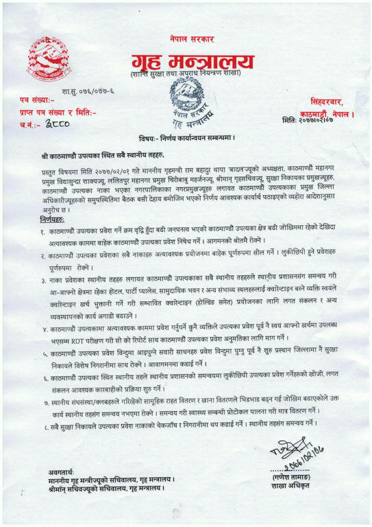 साथै कुनै कामले काठमाडौं उपत्यकाभित्र प्रवेश गर्न परे आफ्नै खर्चमा आरडिटी परीक्षण गरी रिपोर्ट देखाउनु पर्ने पनि गृह मन्त्रालयले जनाएको छ ।