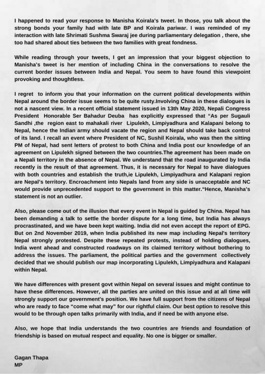 पत्रमा थापाले लिम्पियाधुरा नेपालको भूमि रहेको स्पष्ट पार्दै मनिषाले राखेको धारणा तथ्यसंगत भएको उल्लेख गरेका छन् ।