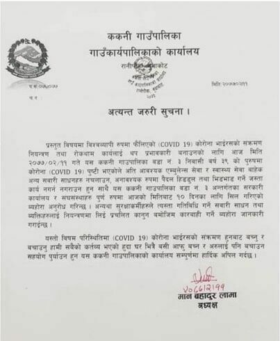 कोरोना संक्रमण देखिएपछि ककनी गाउँपालिकाले जारी गर्‍यो यस्तो सूचना
