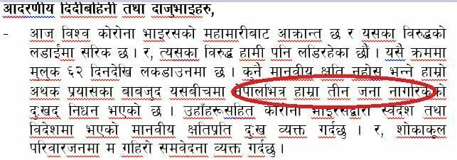 उनले उनीहरुसहित स्वदेश तथा विदेशमा भएको मानवीय क्षतिप्रति दुःख व्यक्त गर्दै शोकाकुल परिवारमा गहिरो समवेदना प्रकट गरेका छन्। तर कोरोनाको कारण हालसम्म नेपालमा ४ जनाको मृत्यु भइसकेको छ । उनको सम्बोधनलगत्रै मिडियामा आएको पूर्णपाठको स्क्रिप्टमा पनि यो अपडेट नगरेको पाईयो ।