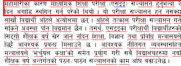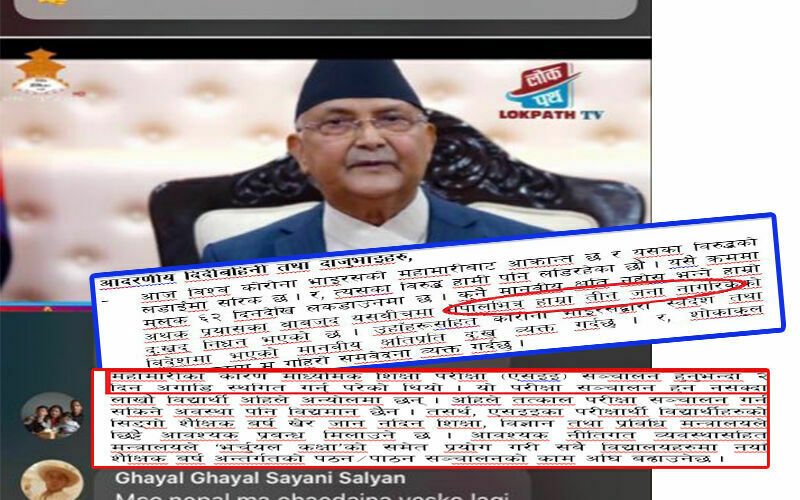 प्रधानमन्त्री केपी शर्मा ओलीले सम्बोधनको क्रममा गत वर्षको एसईई २ दिन अगाडी रोकेको भनेका छन् (सुन्नुहोस् उनको सम्बोधनको १० मिनेट ४० सेकेण्डमा बोलेको अडियो क्लिप ।) तर गत वर्ष मार्च १८ २०२० अर्थात् चैत्र ६ गतेदेखि हुने एसईई केहि घण्टाअगाडी अर्थात् चैत्र ५ गते बुधबार ५ बजेर ४० मिनेटमा स्थगित गरिएको सूचना आएको थियो । उपप्रधानमन्त्री ईश्वर पोखरेलको नेतृत्वमा रहेको कोरोनाभाइरस रोकथामसम्बन्धी उच्चस्तरीय समन्वय समितिले चैत्र ६ गते बिहीवारबाट सुरु गर्ने भनिएको एसईई परीक्षा स्थगित गर्ने निर्णय गरिब १४ घण्टाअघि मात्रै गरेको थियो। त्यसपछि देशका विभिन्न स्थानबाट दुई दिन लगाएर हिँडेर आएका विद्यार्थीहरु घर फर्कनुपरेको भन्दै टिकाटिप्पणी भएको थियो भने ग्रामिण भेगबाट आएका विभिन्न जिल्लाका विद्यार्थीलाई स्थानीय सरकारको समन्वयमा समेत घर पठाईएको थियो । तर उनले आज सम्बोधनका क्रममा २ दिन अगाडी एसईई सारेको भनेर बोलेका छन् । मिडियालाई प्राप्त भएको उनको समबोधनको पूर्णपाठमा पनि त्यहि कुरा लेखिएको छ ।