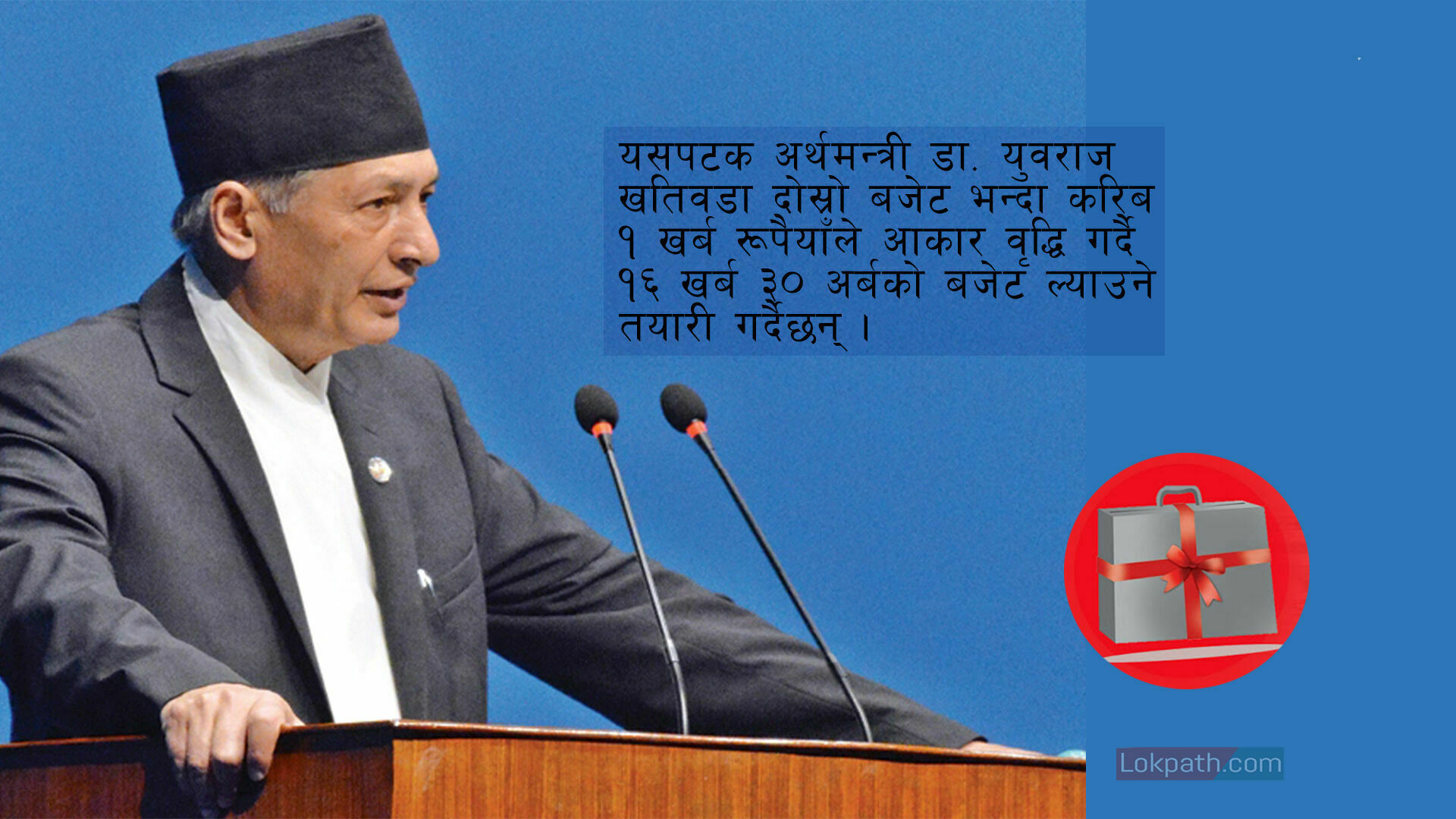 अर्थमन्त्री डाक्टर युवराज खतिवडाले आफ्नो पहिलो बजेट १३ खर्ब १५ अर्ब रूपैयाँको ल्याएका थिए । दोस्रो बजेट भने एकैपटक २ खर्ब १७ अर्बले बढाएर १५ खर्ब ३२ अर्ब पुर्याएका थिए । जुन चालू आर्थिक वर्षको बजेट हो । विश्वस्त सुत्रहरुका अनुसार यसपटक अर्थमन्त्री डा. युवराज खतिवडा दोस्रो बजेट भन्दा करिब १ खर्ब रूपैयाँले आकार वृद्धि गर्दै १६ खर्ब ३० अर्बको बजेट ल्याउने तयारी गर्दैछन् ।