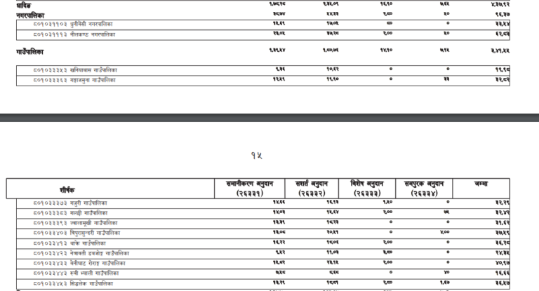 यसैगरी बनियाबास गाउँपालिकाले १९ करोड ९८ लाख, गंगाजमुना गाउँपालिकाले ३२ करोड २ लाख, गजुरी गाउँपालिकाले ३२ करोड २९ लाख, गल्छी गाउँपालिकाले ३२ करोड ४२ लाख, ज्वालामुखी गाउँपालिकाले ३१ करोड ६२ लाख, त्रिपुरासुन्दरी गाउँपालिकाले ३७ करोड ५९ लाख, थाक्रे गाउँपालिकाले ३६ करोड २ लाख, नेत्रावती डबजोङ गाउँपालिकाले २४ करोड ३५ लाख, बेनीघाट रोराङ गाउँपालिकाले ४० करोड ९७ लाख, रुबी भ्याली गाउँपालिकाले १६ करोड ६६ लाख र सिद्धलेक गाउँपालिकाले ३६ करोड ५७ लाख बजेट अनुदान पाउनेछन् ।