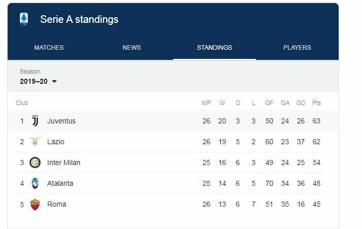 यस सिजन युभेन्ट्स ६३ अंकसहित शीर्ष स्थानमा रहेको छ । दोस्रो स्थानको लाजियोको ६२ अंक रहेको छ ।