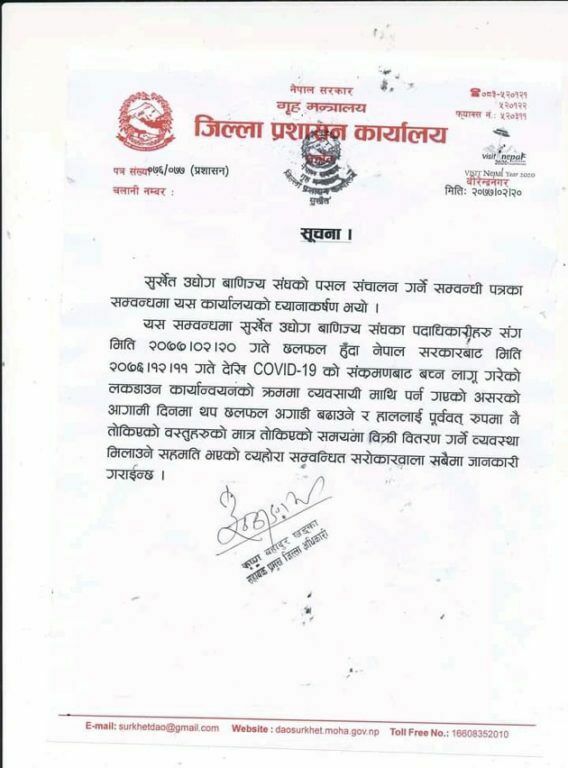 तर सुर्खेत प्रशासनले तोकिएका तरकारी, फलफुल, ग्यास र खाद्यान्न लगायतका पसल बाहेक अन्य पसलहरू नखोल्न चेतावनी दिएको हो। यसबारे उद्योग वाणिज्य संघसंग छलफल गरिने सुर्खेत प्रशासनले जनाएको छ ।