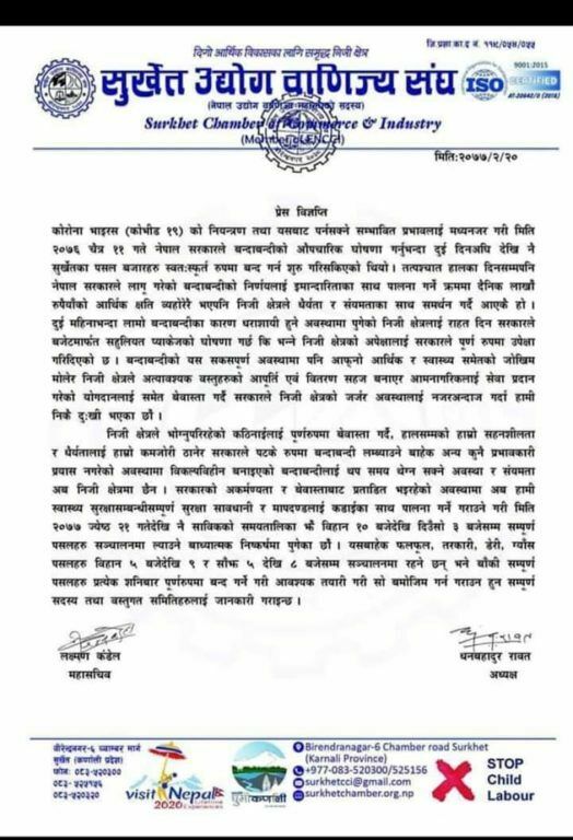 मंगलवार सुर्खेत उद्योग वाणिज्य संघले एक विज्ञप्ति जारी गर्दै भोलिदेखि शनिवारबाहेक बिहान १० बजेलेखि दिउँसो ३ बजेसम्म वीरेन्द्रनगरमा सबै पसलहरू खुल्ने जनाएको थियो ।