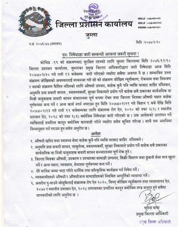 काठमाडौं । कोरोना जोखिम न्यूनिकरणको लागि जुम्लामा ३ दिनको लागि निषेधाज्ञा जारी गरिएको छ ।