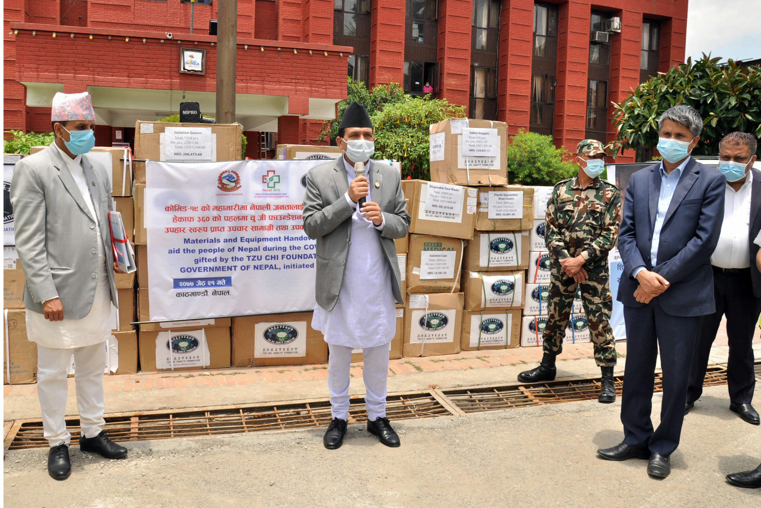 अन्तर्राष्ट्रिय बौद्ध संस्था चु जी फाउण्डेशनको पहलमा हेल्थ इन्भ्याइरोन्मेन्ट एण्ड क्याइमेट एक्सन फाउण्डेशन (हेकाफ ३६०) ले आज उपलब्ध गराएको स्वास्थ्य सामग्री ग्रहण गर्दै मन्त्री ढकालले सामान्यावस्थाका बिरामीलाई उपचारका लागि आइसोलेसनकक्ष स्थापना गरी त्यहाँ राखिने बताए । उनले अन्तर्राष्ट्रिय अभ्यास र अध्ययनमा सङ्क्रमित भएकामध्ये ८० प्रतिशत बिरामी सामान्यावस्थाका हुने भएकाले गम्भीर अवस्थाका बिरामीलाई अस्पताल र उपचारको अभाव नहोस् भन्नाका लागि अब नयाँ नीतिमा जाने स्पष्ट गरे ।