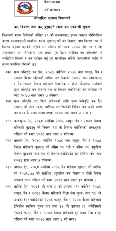 काठमाडौं । चौतर्फी आलोचना भएपछि सरकारले कर बुझाउने म्याद थप गरेको छ ।