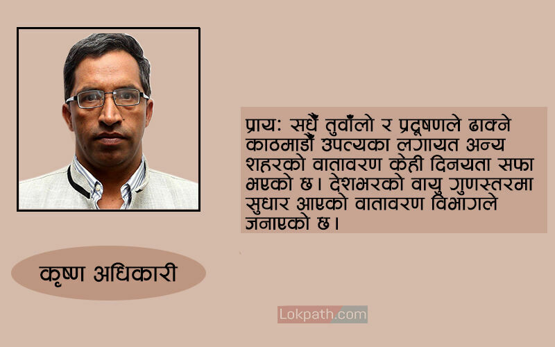 कोरोनाको सङ्क्रमणबाट बच्न अपनाइएको लकडाउनले आर्थिक क्रियाकलापहरु खुम्चिँदा जनजीविकामा प्रत्यक्ष असर पुगेको छ । यद्यपि, लकडाउनले गर्दा सवारी साधन, उद्योग कलकारखाना र प्रदूषण बढाउने अन्य गतिविधि ठप्प भएपछि वातावरणीय स्वच्छतामा आएको सुधारलाई हेर्दा त्यसले मानव जातिको स्वच्छ वातावरणमा बाँच्न पाउने अधिकारको स्थापित गरेको छ । प्रायः सधैँ तुवाँलो र प्रदूषणले ढाक्ने काठमाडौँ उपत्यकालगायत अन्य शहरको वातावरण केही दिनयता सफा भएको छ । देशभरको वायु गुणस्तरमा सुधार आएको वातावरण विभागले जनाएको छ ।