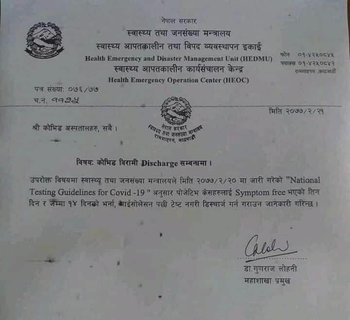 मन्त्रालयको स्वास्थ्य आपत्कालीन तथा विपद् व्यवस्थापन इकाई, स्वास्थ्य आपत्कालीन कार्यसञ्चालन केन्द्रका प्रमुख डा गुणराज लोहनीले सबै कोभिड अस्पताललाई जेठ २० गते जारी गर्दै भनेका छन्, “नेशनल टेस्टिङ गाइनलाइड फर कोभिड(१९’ अनुसार पोजेटिभ केसलाई लक्षण देखिन छोडेको ३ दिन र जम्मा १४ दिनको भर्नालाई आइसेलेन पछि टेस्ट नगरी डिस्चार्ज गर्न गराउन जानकारी गरिन्छ ।”