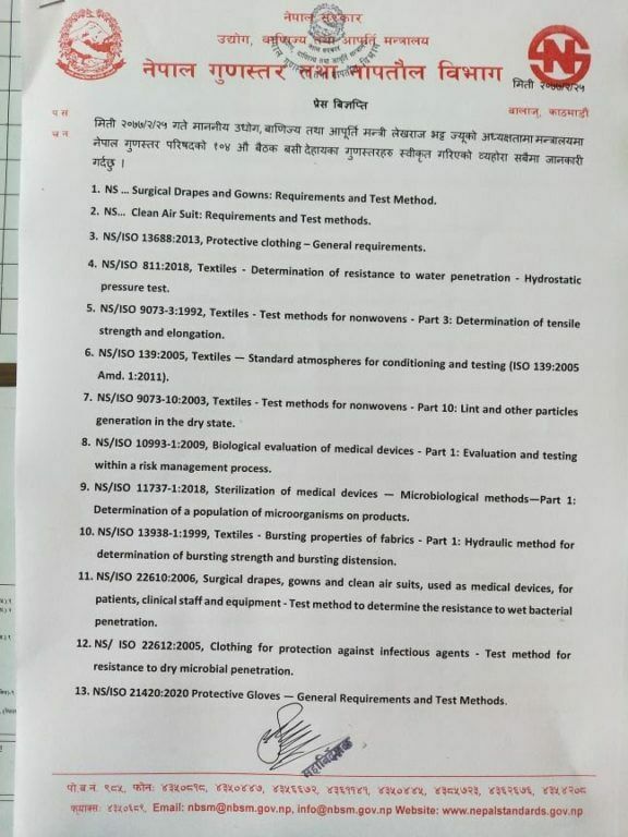 परिषदको आइतबार बसेको १०४ औं बैठकले पहिलोपटक एन ९५ मास्कदेखि सर्जिकल मास्क लगायत विभिन्न उत्पादनको तथा वस्तुको गुणस्तर मापदण्ड स्वीकृत गरेको हो ।