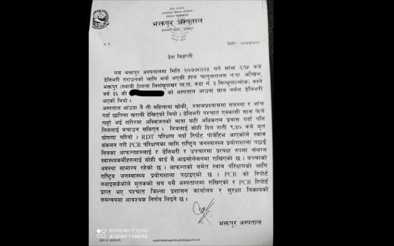 काठमाडौं । भक्तपुर अस्पतालमा मृत्यु भएकी सुत्केरीमा आरडीटी परीक्षण गर्दा पोजेटिभ देखिएको र पीसीआर जाँचका लागि टेकु पठाइएको अस्पतालले जनाएको छ ।