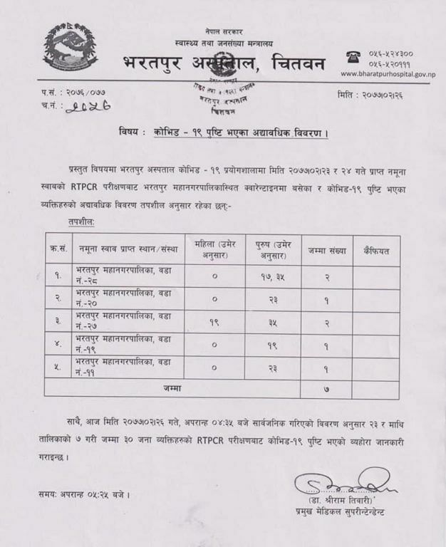 कोरोना संक्रमण पुष्टि हुनेमा भरतपुर महानगरपालिका वडा नं २८ का १७ र ३५ वर्षीय पुरुष, वडा नं २० का २३ वर्षीय पुरुष, वडा नं २७ का १९ वर्षीया युवती र ३५ वर्षीय पुरुष, वडा नं १९ को १९ वर्षीय पुरुष र वडा नं ११ का २३ वर्षीय पुरुष रहेको अस्पतालले जनाएको छ ।