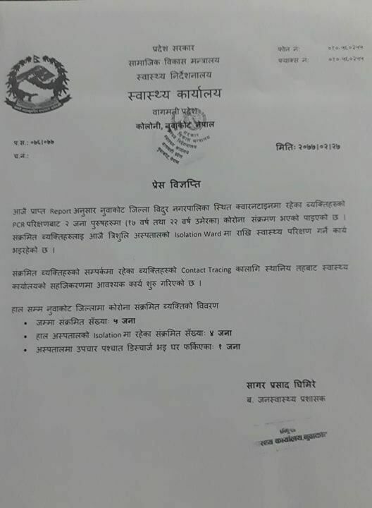 काठमाडौं । नुवाकोट जिल्लामा कोरोना संक्रमितको संख्या ५ पुगेको छ । मंगलवार मात्रै २ जना कोरोना संक्रमित थपिएका छन् ।