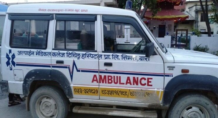 अल्पाईन मेडिकल कलेज टिचिङ हस्पिटल सिमरा बाराको एम्बुलेन्स प्रयोग गरी जि.पर्सा बहुदरमाई न.पा.०५ स्थित भौराट्टार गाँउ तर्फ लैजादै गरेको अवस्थामा प्रहरीले ५६ के.जी.लागु औषध गाँजा र ना.४ च ८५९९ नम्बरको एम्बुलेन्स गाँजासहित तीन जनालाई पक्राउ गरेको छ ।