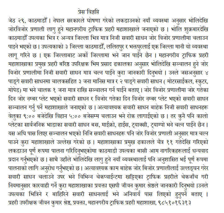 तर कुनै पनि कालो प्लेटका सार्वजनिक भाडाका सवारी साधन बस, माईक्रो, हाईस, ट्याक्सी, ट्याम्पो भने चल्न पाईने छैन । यस अघि पास लिएर सञ्चालन भएको निजि सवारी साधनहरू पनि जोर विजोर प्रणाली अनुसार मात्र चल्न पाउने कुरा महाशाखाले उल्लेख गरेको छ ।