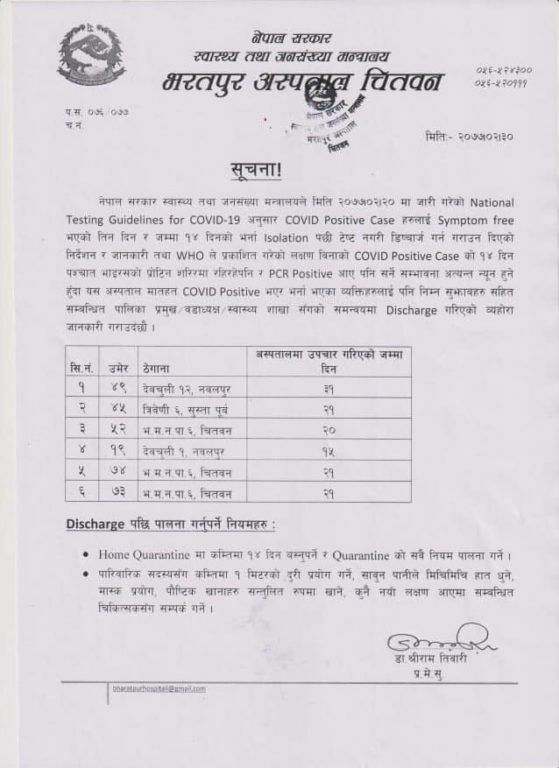 चितवनको भरतपुर अस्पतालमा उपचाररत ६ जना १५ देखि २१ औँ दिनमा घर फर्किएको अस्पतालले जनाएको छ ।