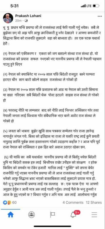 वास्तविकलाई बिर्सेर प्रचण्डले राजसंस्थालाई गाली भनेको आफू सिद्धान्त भ्रस्ट भएको वास्तविकतालाई लुकाउने प्रयास बाहेक अरु केही नभएको लोहनीको तर्क छ ।