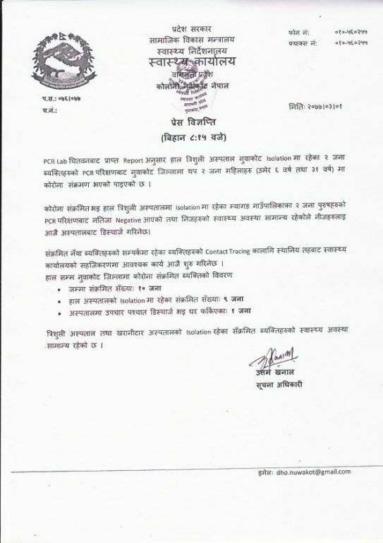 उनीहरु हाल त्रिशुली अस्पतालको आइसोलसनमा रहेका छन् । यो सँगै नुवाकोटमा हालसम्म १० जनामा कोरोना संक्रमण देखिएको छ । ती मध्ये १ जना कोरोना उपचारपछि निको भएर घर फर्किएका छन् । भने बाँकीको त्रिशुली अस्पताल तथा खरानीटारमा रहेको आइसोलेसनमा राखि उपचार भइरहेको मन्त्रालयले जनाएको छ ।