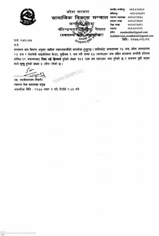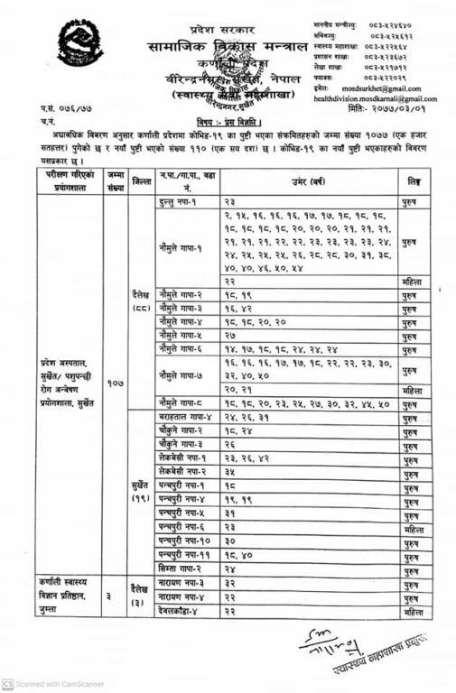 कर्णाली प्रदेश अन्तर्गत दैलेख र सुर्खेतमा गरी १ सय १० जनामा कोरोना पुष्टि भएको सामाजिक विकास मन्त्रालय कर्णाली प्रदेशले जनाएको छ ।