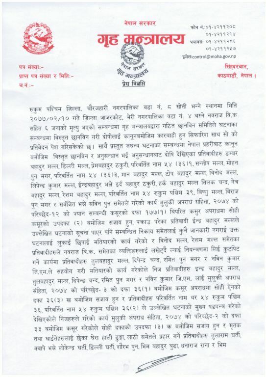 रुकुमपश्चिम घटनाका दोषीमाथि कारवाही प्रारम्भः गृह मन्त्रालय (विज्ञप्तीसहित)