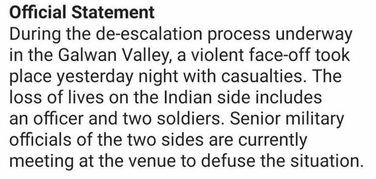 भारतीय सेनाको तर्फबाट जारी गरिएको बयानमा गलवान घाटीमा सोमवार राती डि एस्केलेशनको प्रक्रियाका बेला चीन र भारतका सैनिकमा हिंस्रक झडप भएको थियो ।