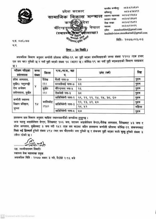 योसंगै हालसम्म कर्णाली प्रदेशमा जम्मा कोरोना पुष्टि भएको संख्या १ हजार १ सय ४ पुगेको सामाजिक विकास मन्त्रालय कर्णाली प्रदेशले जनाएको छ ।
